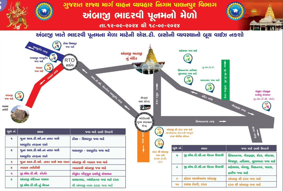 યાત્રાધામ અંબાજી ખાતે આજથી (12 સપ્ટેમ્બર) ભાદરવી પૂનમના મેળાની શરુઆત થઈ ગઈ છે, ત્યારે વહેલી સવારે મંગળા આરતીમાં ભક્તોનો મહાસાગર અંબાજી મંદિરે દર્શન કરવા પહોંચ્યો હતો. આ દરમિયાન દર્શનાર્થે આવેલા ભક્તોને પરત ફરવા માટે ગુજરાત રાજ્ય માર્ગ વાહન વ્યવહાર નિગમ – પાલનપુર વિભાગ દ્વારા ખાસ બસની વ્યવસ્થા કરવામાં આવી છે. જેમાં ભક્તોને પોતાના વતન પરત ફરવા માટે એસટી બસોની વ્યવસ્થાને લઈને બૂથ વાઇઝ મેપ બહાર પાડવામાં આવ્યો છે. ચાલો જાણીએ કયા રૂટની બસો ક્યાં મળશે.