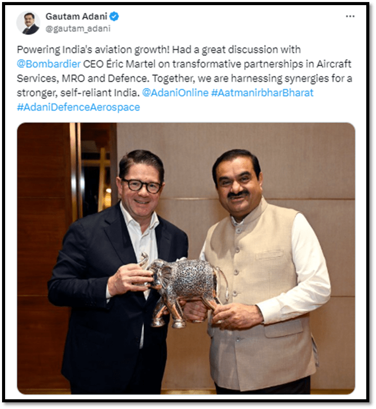 અદાણી ગ્રૂપના સ્થાપક અને ચેરમેન ગૌતમ અદાણી અને બોમ્બાર્ડિયર ઇન્કના ચીફ એક્ઝિક્યુટિવ ઓફિસર (CEO) એરિક માર્ટેલ વચ્ચે ખાસ મુલાકાત યોજાઈ હતી. મંગળવારે થયેલી આ ઉચ્ચ સ્તરીય બેઠકમાં ભારતની ઉડ્ડયન ક્ષમતાઓને વધારવાના હેતુથી ટ્રાન્સફોર્મેંટીવ પાર્ટનરશીપ અંતર્ગત વિચાર વિમર્શ કરવામાં આવ્યો હતો. જેમાં ડિફેન્સ સેક્ટર, ઉડ્ડયન સેવાઓ, તેની જાળવણી, સમારકામ સહિતના વિષયો અંગે ચર્ચા થઈ હતી. ગૌતમ અદાણીએ એરિક માર્ટેલના સાથેની મુલાકાત વિશે ઉત્સાહ વ્યક્ત કર્યો હતો.