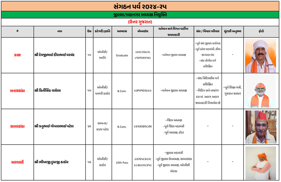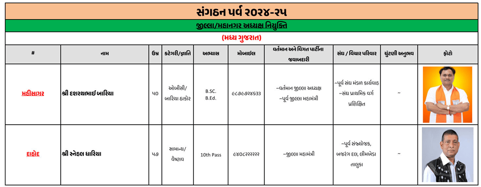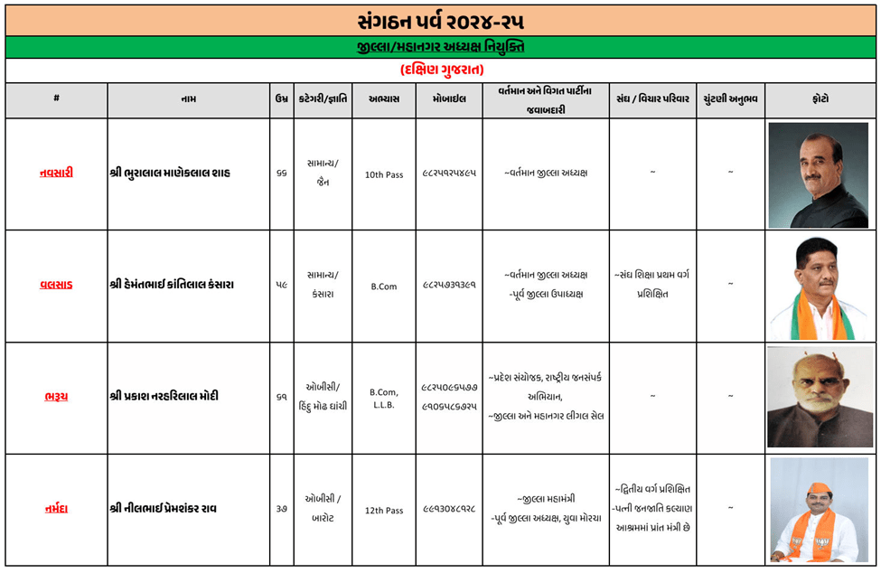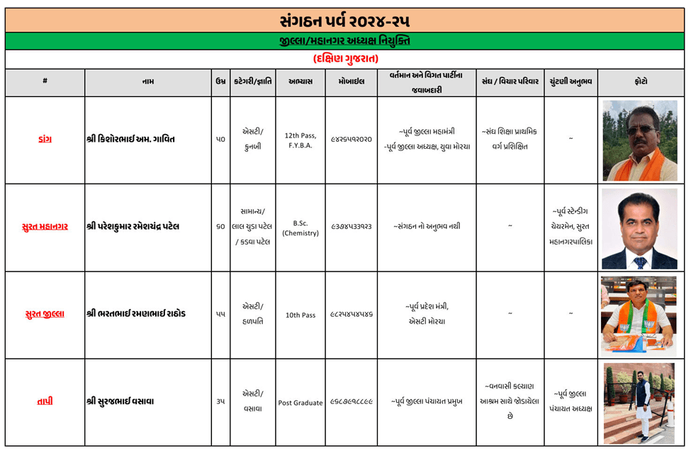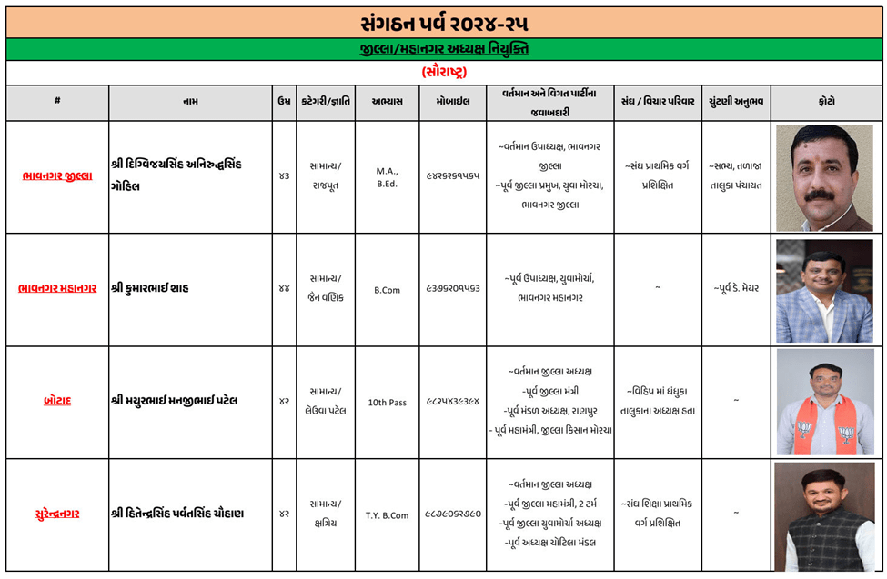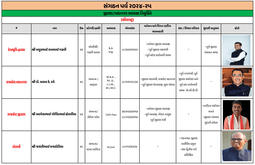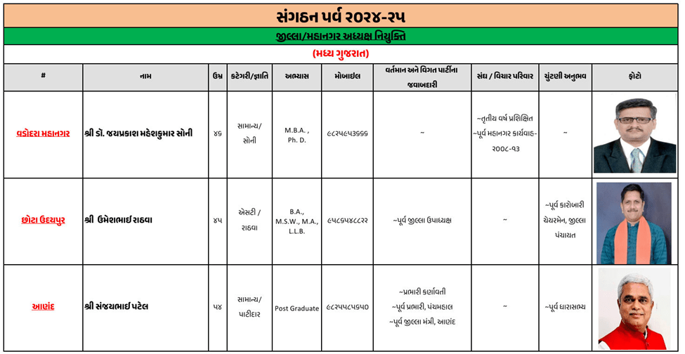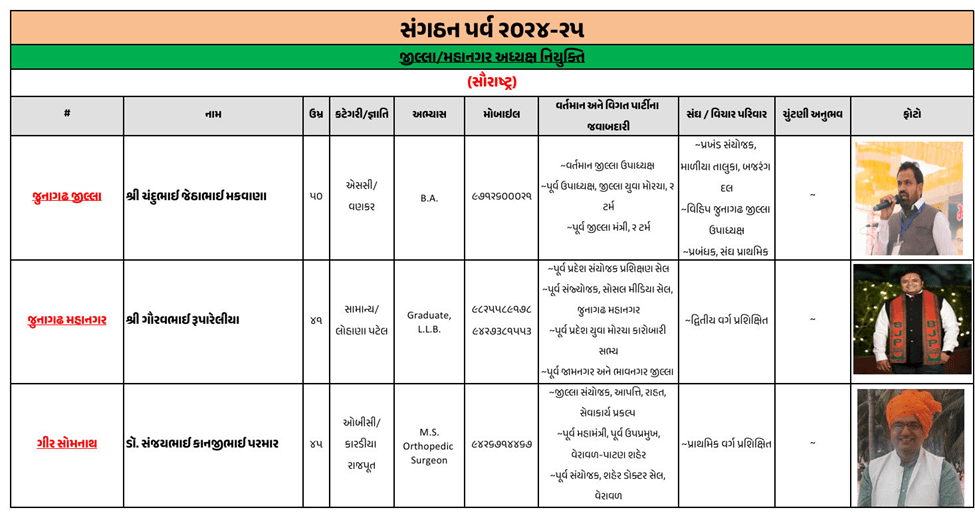 ગુજરાતના મોટાભાગના જિલ્લા અને શહેરના નવા ભાજપ પ્રમુખની જાહેરાત ભાજપે કરી દીધી છે. જૂનાગઢ જિલ્લા ભાજપ પ્રમુખ તરીકે ચંદુભાઈ મકવાણાની વરણી કરવામાં આવી છે, જ્યારે અમરેલીમાં અતુલ કાનાણી, બનાસકાંઠામાં કીર્તિસિંહ વાઘેલા, સુરતમાં ભરતભાઈ રાઠોડ, ગાંધીનગરમાં અનિલ પટેલની નિમણૂક કરવામાં આવી છે.