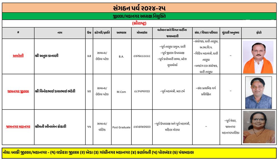 ભાજપે શહેર જિલ્લા પ્રમુખોની જાહેરાતની જે યાદી બહાર પાડી છે તેમાં હજુ પણ કેટલાક શહેર અને એક જિલ્લાના પ્રમુખની જાહેરાત કરવામાં નથી આવી, જેમ કે, વડોદરા જિલ્લા પ્રમુખ, ગાંધીનગર, અમદાવાદ, પોરબંદર, અને પંચમહાલ શહેરના પ્રમુખના નામની જાહેરાત બાકી છે.