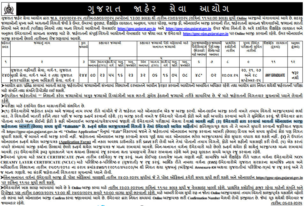 ગુજરાત જાહેર સેવા આયોગ (GPSC) દ્વારા ગુજરાત વહીવટી સેવા વર્ગ 1, ગુજરાત મુલ્કી સેવા વર્ગ 1-2 તથા ગુજરાત નગરપાલિકા મુખ્ય અધિકારી સેવા વર્ગ 2 માટે કુલ 244 જગ્યાઓ પર ભરતી પ્રક્રિયાને લઈને નોટિફિકેશન બહાર પાડવામાં આવ્યા છે.