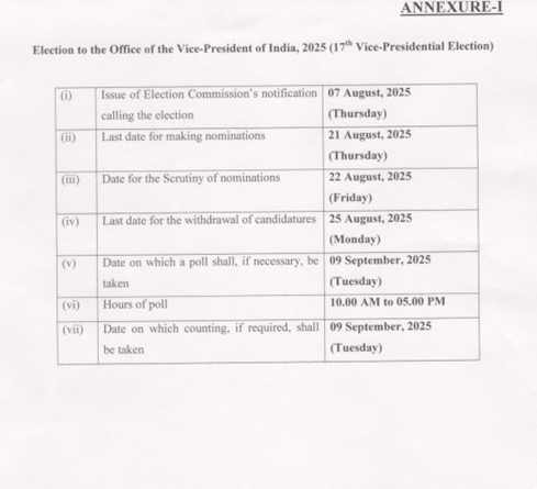 ચૂંટણી પંચે ભારતના ઉપરાષ્ટ્રપતિ પદ માટે ચૂંટણીનો કાર્યક્રમ જાહેર કર્યો છે. 21મી ઓગસ્ટ સુધી ઉમેદવારી ફૉર્મ સ્વીકારવામાં આવશે અને જો જરૂર પડી તો 9 સપ્ટેમ્બરે મતદાન થશે. મતદાનનો સમય સવારે 10થી સાંજના 5 વાગ્યા સુધીનો રહેશે. 9મી સપ્ટેમ્બરે જ પરિણામ પણ જાહેર કરાશે. 21 જુલાઈના રોજ જગદીપ ધનખડના અચાનક રાજીનામા બાદ દેશના બીજુ સર્વોચ્ચ બંધારણીય પદ ખાલી થયુ હતું.