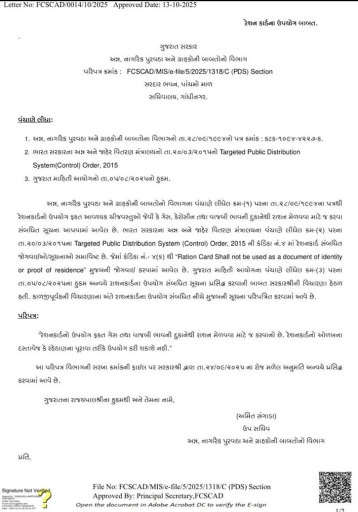 રાજ્યના લાખો રેશનકાર્ડ ધારકો માટે એક મહત્ત્વના સમાચાર સામે આવ્યા છે. ગુજરાત સરકારના અન્ન અને નાગરિક પુરવઠા વિભાગ દ્વારા એક મોટો નિર્ણય લેવામાં આવ્યો છે, જે અંતર્ગત હવેથી રેશનકાર્ડનો ઉપયોગ ઓળખના પુરાવા (Identity Proof) કે રહેઠાણના પુરાવા (Address Proof) તરીકે કરી શકાશે નહીં.
