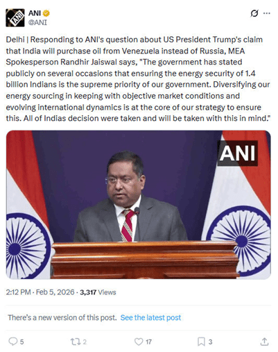 ડોનાલ્ડ ટ્રમ્પે દાવો કર્યો હતો કે ભારત હવે રશિયાના બદલે વેનેઝુએલા પાસેથી ઓઈલ ખરીદશે. જેના જવાબમાં ભારતના વિદેશ મંત્રાલયના પ્રવક્તા રણધીર જયસ્વાલે કહ્યું કે 140 કરોડ ભારતીયોની ‘એનર્જી સિક્યોરિટી’ સરકારની સર્વોચ્ચ પ્રાથમિકતા છે. ભારતે સ્પષ્ટ કર્યું કે અમે ક્યાંથી ઓઈલ ખરીદવું તે બજારની સ્થિતિ અને આંતરરાષ્ટ્રીય ગતિશીલતાના આધારે નક્કી કરીશું.