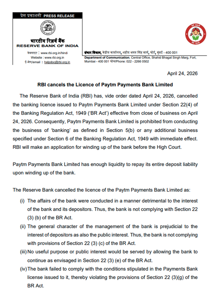 પેટીએમ પેમેન્ટ્સ બેંકનું કામકાજ આજથી 24 એપ્રિલથી સંપૂર્ણપણે બંધ કરી દેવામાં આવ્યું છે. ભારતીય રિઝર્વ બેંકે પેટીએમ પેમેન્ટ્સ બેંક લિમિટેડ (PPBL)નું બેંકિંગ લાઇસન્સ તાત્કાલિક અસરથી રદ કરી દીધું છે.